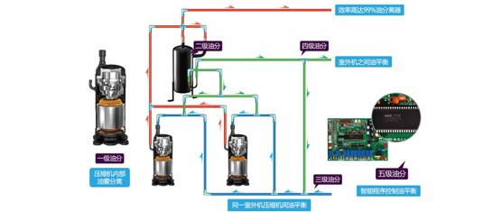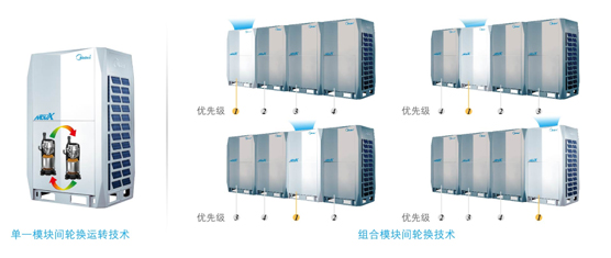 系統(tǒng)根據(jù)系統(tǒng)負(fù)荷情況,輪換設(shè)置優(yōu)先開(kāi)啟的室外機(jī)模塊的壓縮機(jī)順序,平衡分配每臺(tái)室外機(jī)模塊的運(yùn)行時(shí)間,大大提高了機(jī)組的可靠性和使用壽命。