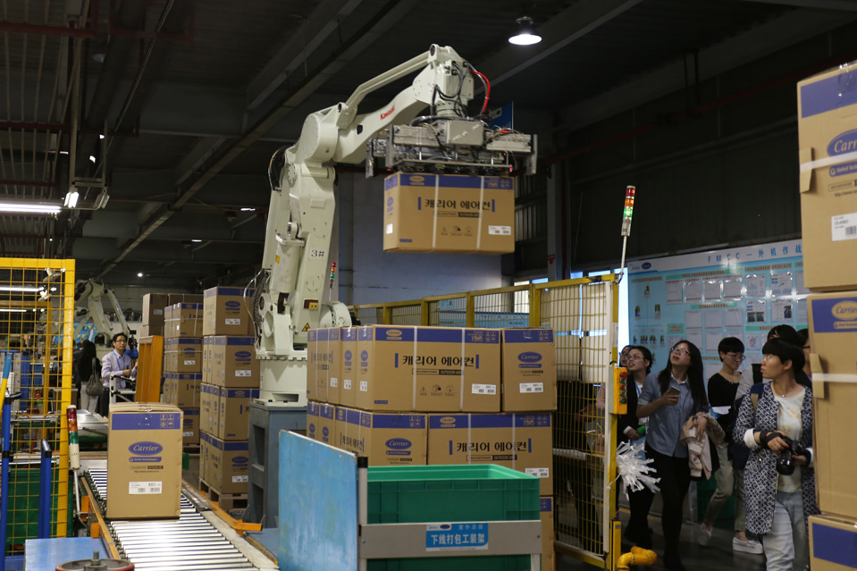 現(xiàn)在的空調生產(chǎn)線,出現(xiàn)的已不再是擁擠忙碌得跟陀螺似的產(chǎn)業(yè)工人。因為不少的“機器手”、“機器人”的出現(xiàn),勞動密集型的家電制造工廠被賦予了全新的“科技感”和“智能化”的色彩。在空調室內、外機總裝線體的末端,裝箱、打包等繁重環(huán)節(jié),早已被機器人所取代。當成品從生產(chǎn)線上完成之后,也是通過機器手直接搬運到流轉板上。
